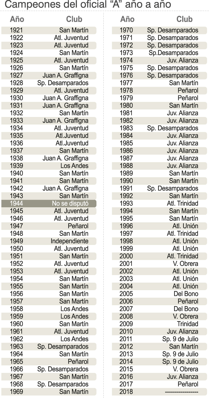 Los dos ya tuvieron su merecido festejo por el campeonato obtenido, pero hoy irán por la gloria máxima. En el Bicentenario, desde las 22 y con ambas hinchadas, Desamparados y Atenas de Pocito, campeones de los Torneos de Invierno y Verano, respectivamente, definirán al dueño del título anual que será quien estampe su nombre en el largo historial de campeones de la Liga Sanjuanina de Fútbol (ver infografía).