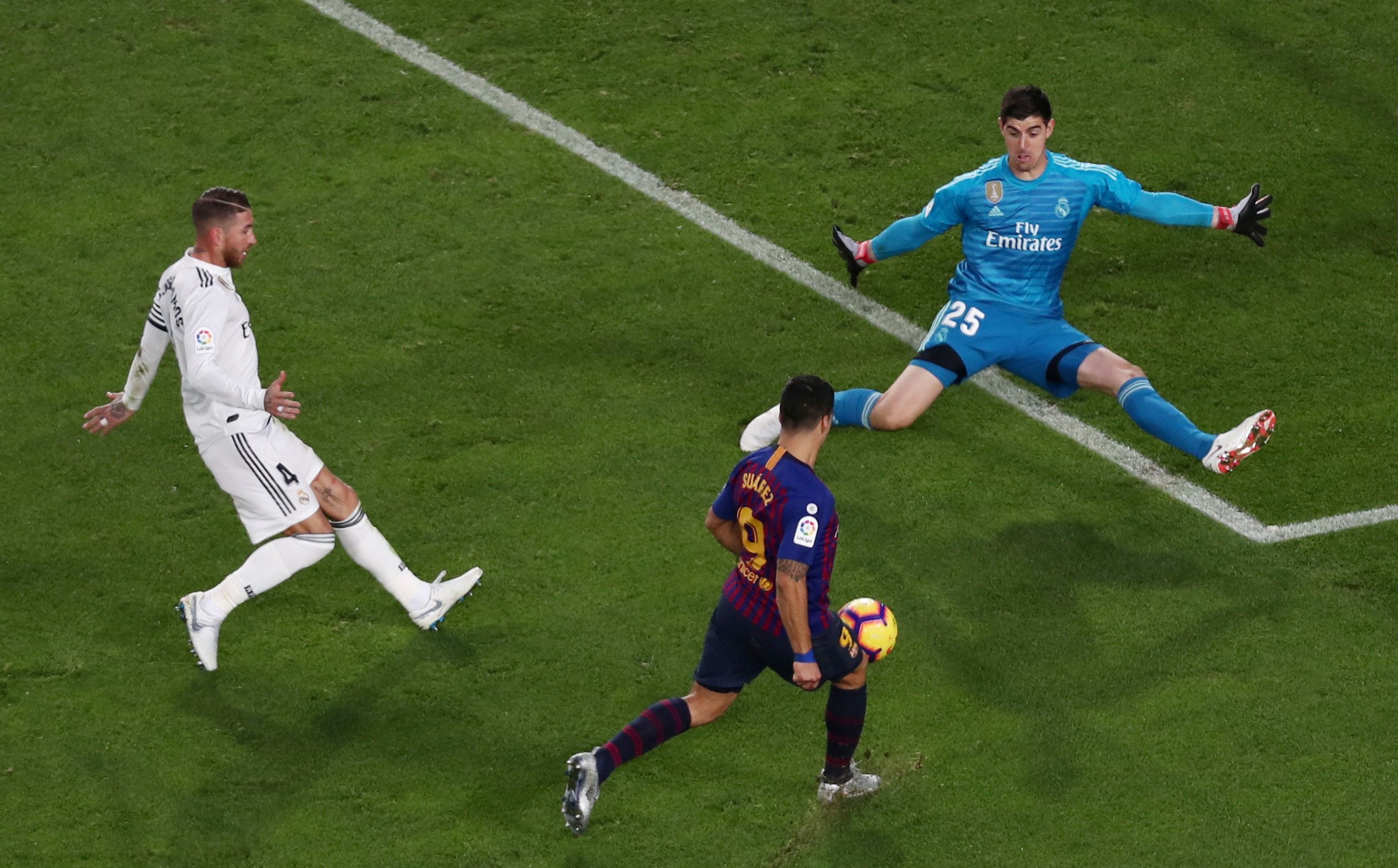 Magistral. La definición de Luis Suárez, de Barcelona, ante la salida del arquero del Real Madrid. El charrúa marcó tres gritos en el derby español.