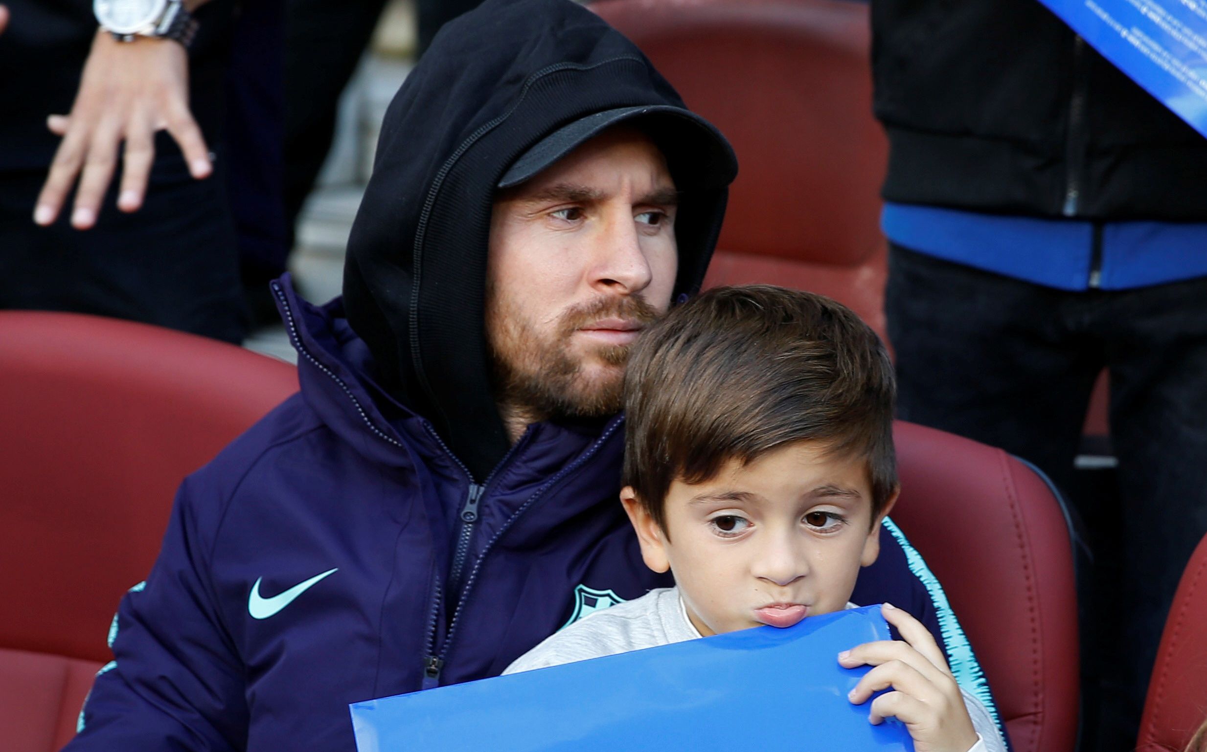 El hincha principal. Lionel Messi se ubicó en la platea junto a su hijo Thiago para observar el encuentro.