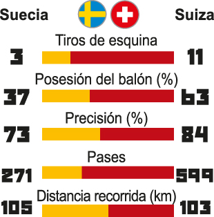 En un partido disputado con cautela desde los primeros compases, los suecos echaron mano de la fórmula que mejor le ha funcionado hasta el momento: replegarse, defender con solidez y golpear a la contra. Suiza, por lo tanto, ha sido el equipo más activo sobre el terreno de juego cuando tuvo el balón. Sin embargo, el planteamiento reactivo del conjunto de Janne Andersson ha resultado más fértil.