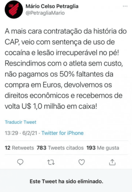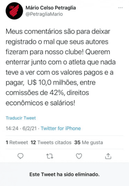 "¡La contratación más cara de la historia de Paranaense, llegó con sentencia por consumo de cocaína y lesión irremediable en el pie! Rescindimos con el deportista sin coste alguno, no pagamos el 50% faltante de la compra en Euros, devolvimos los derechos patrimoniales y recuperamos 1 millón en efectivo", arrancó Mário Celso Petraglia.