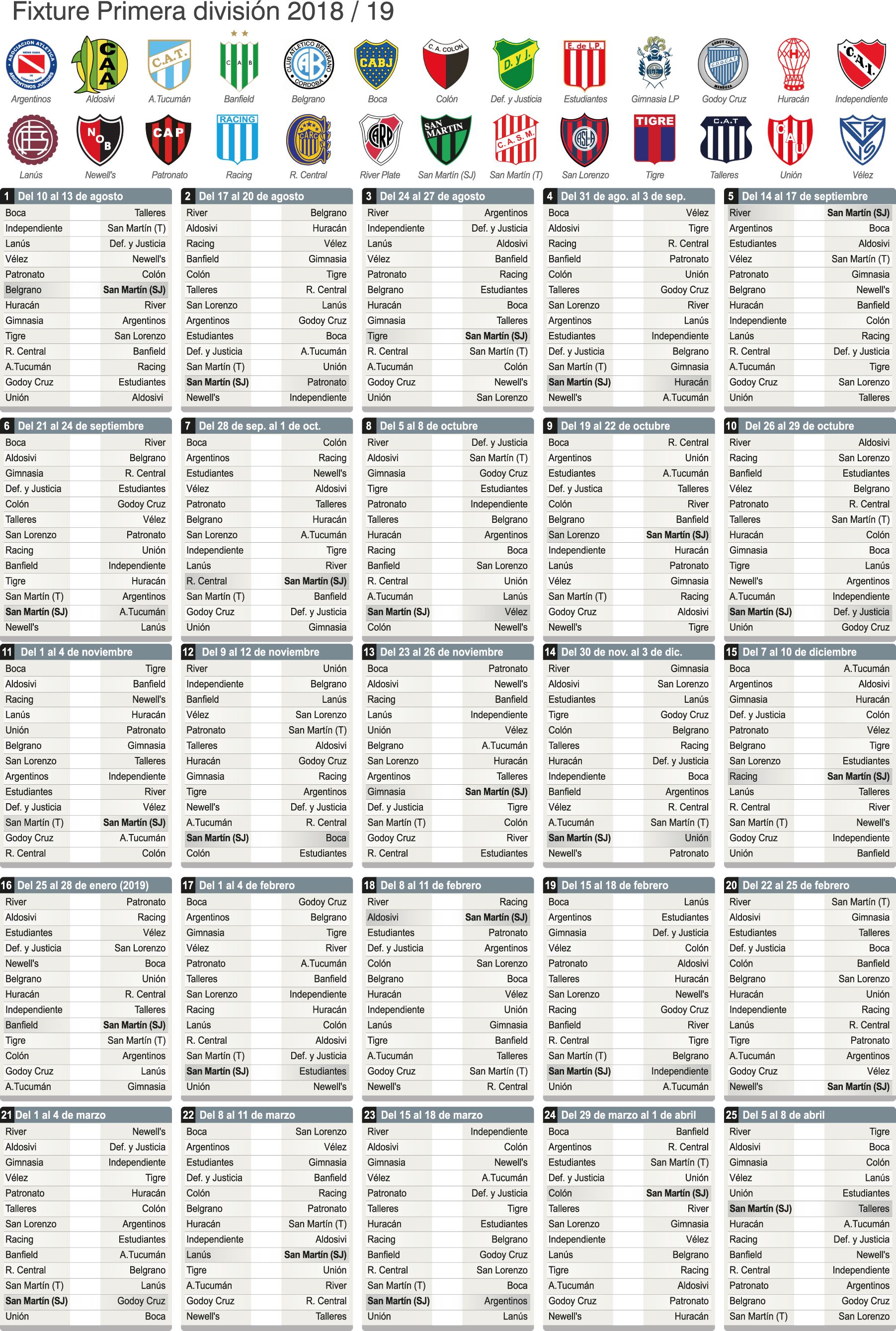 Fixture completo de la Superliga 2018-19 que tendrá continuidad hasta el 10 de diciembre de este año. Luego del receso, volverá el 25 de enero y cerrará el 8 de abril del próximo año.