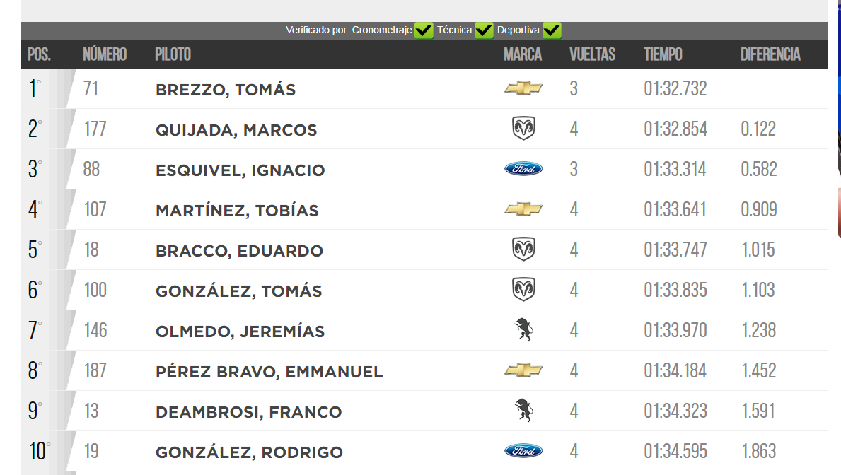 De hecho, se reiteraron varios apellidos involucrados en la vanguardia. La pole la consiguió nuevamente Tomás Brezzo, en tanto que Marcos Quijada, el actual puntero del campeonato, obtuvo el segundo puesto e Ignacio Esquivel se posicionó tercero.