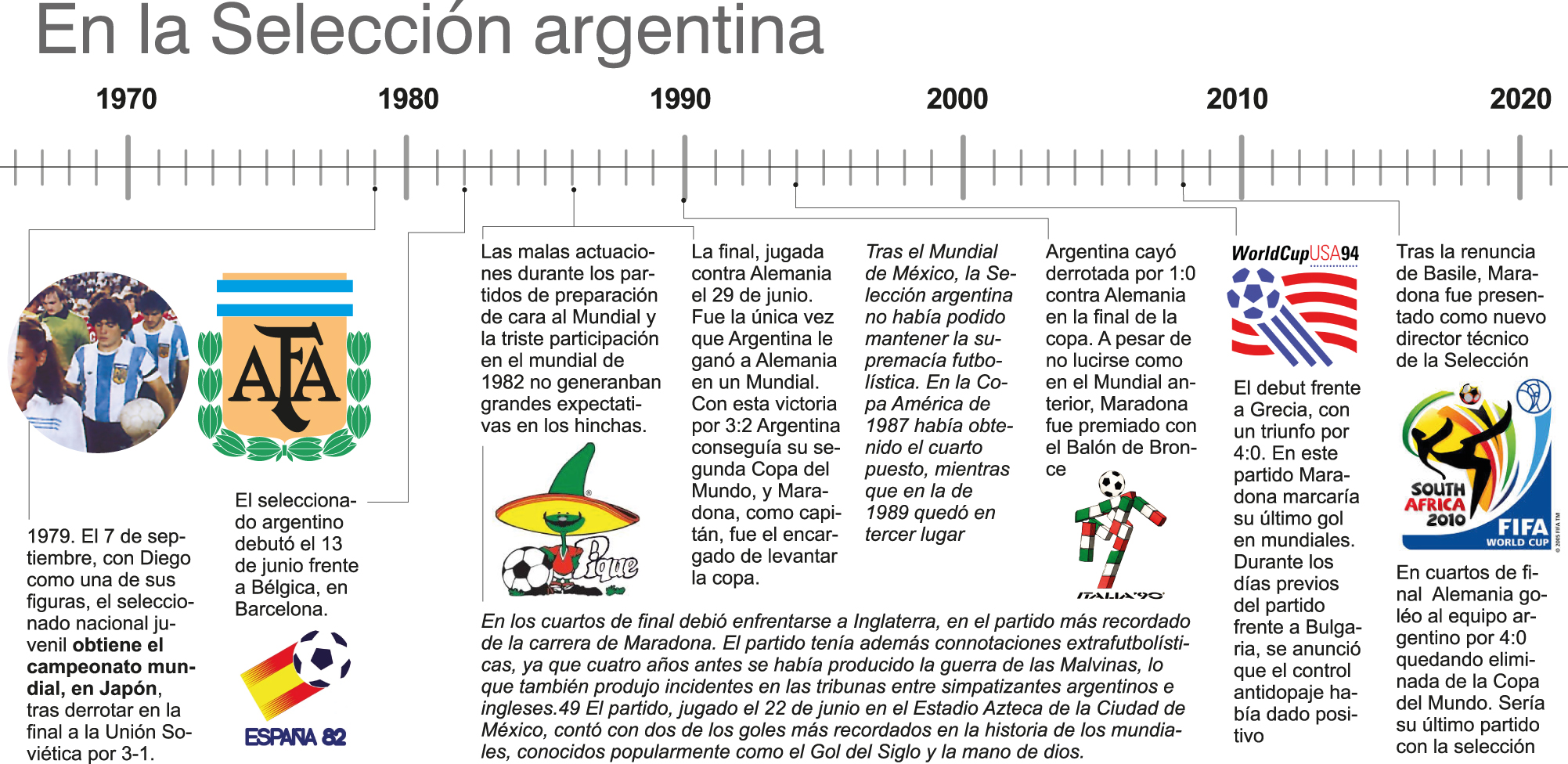 Diego agotó cualquier adjetivo sobre su condición de futbolista, pero además tuvo un coraje y un temple sin par que lo llevó a ser el líder del seleccionado que ganó el Mundial Juvenil Japón ’79, el extraordinario campeón de México ’86, el épico subcampeón de Italia ’90 y el Mesías que volvió para clasificar a Argentina al Mundial de Estados Unidos ’94, donde le "cortaron las piernas" pero no pudieron mellar su espíritu.