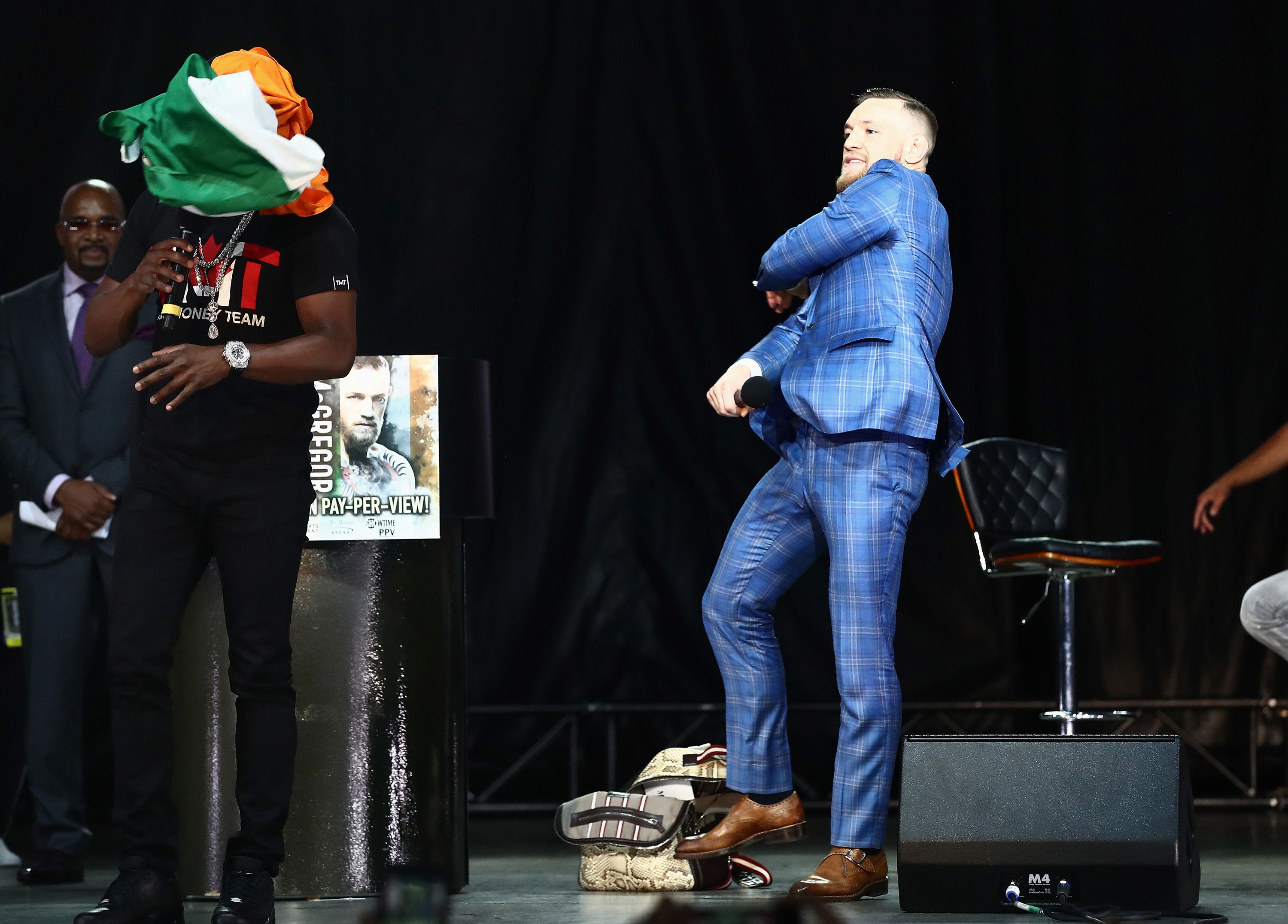 La pelea de Floyd Mayweather y Conor McGregor del 26 de agosto se aproxima y ayer se realizó la segunda conferencia de promoción, en este caso en Toronto, Canadá. El punto cúlmine de tensión se dio cuando Floyd tomó la bandera irlandesa y McGregor lo amenazó: "Hacés algo con mi bandera y te mató", le espetó.