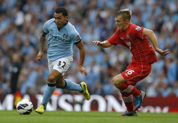 Carlos Tevez marcó un gol y Sergio ‘Kun’Agüero se lesionó la rodilla derecha, en apariencia de gravedad, durante la victoria del Manchester City, actual campeón inglés, sobre Southampton 3-2, de local, por la primera fecha de la liga inglesa 2012-2013. El ex delantero de Boca abrió el marcador a los 40 minutos del primer tiempo, el bosnio Edin Dzeko (27m.ST), reemplazante de Agüero, logró el 2-2 y el francés Samir Nasri consiguió el triunfo a diez del final. Southampton había revertido la desventaja inicial con tantos de Rickie Lambert y Steven Davis, a los 14 y 23 minutos del segundo tiempo. Tevez, que festejó su tanto mostraron una camiseta con la leyenda ‘Lugano 1 y 2’, gestó además un penal que el español David Silva falló a los 17 del primer tiempo con el marcador cerrado.