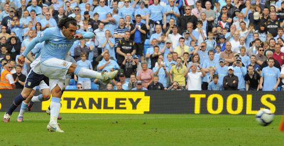 El argentino Carlos Tévez marcó de penal en el triunfo de Manchester City sobre Aston Villa por 3-1, de local, por la 37ma. y penúltima fecha de la liga inglesa de fútbol de primera división, que comenzó a jugarse ayer.