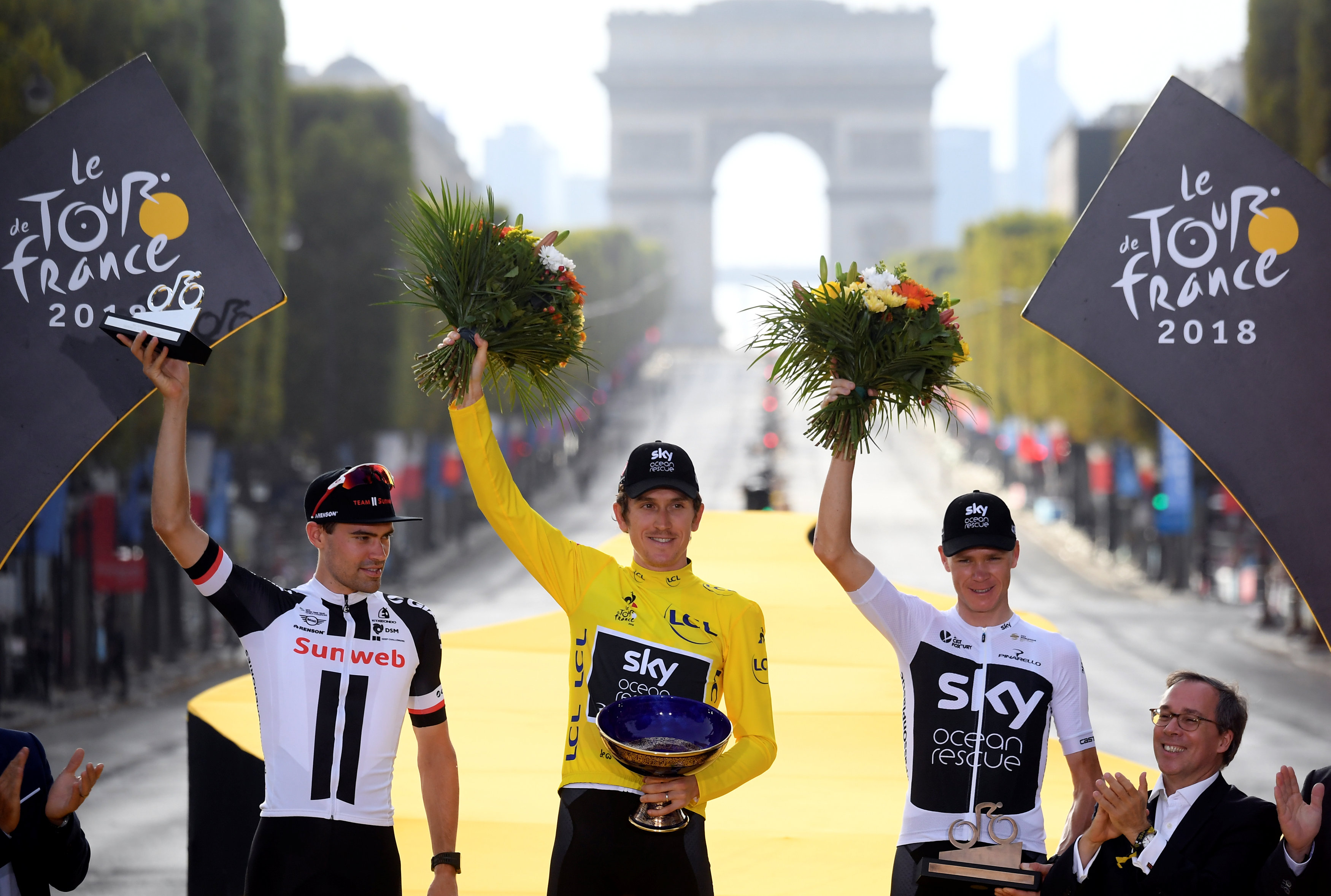 Luego del final de la última etapa, subieron al podio a recibir sus respectivas distinciones, el ganador Thomas como maillot amarillo, el holandés Tom Dumoulin (Sunweb), segundo, y el británico Chris Froome (Sky), tercero.