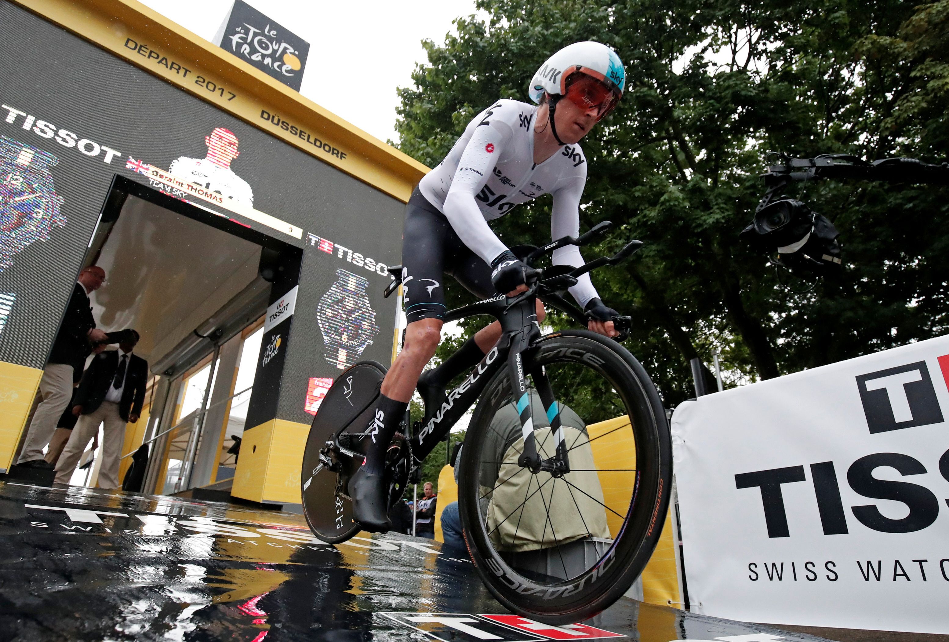 rápido en la crono de 14 kilómetros disputada en Düsseldorf bajo la lluvia, que provocó la caída que eliminó a Alejandro Valverde con una fractura de rótula, así como a Jon Izagirre.