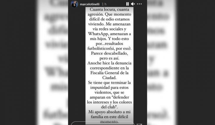Por último, dejó un fuerte mensaje contra los barras: "Se tiene que terminar la impunidad para estos violentos que se amparan en ‘defender los intereses y los colores del Club’", y agregó debajo: "Mi apoyo absoluto a mi familia en este difícil momento".