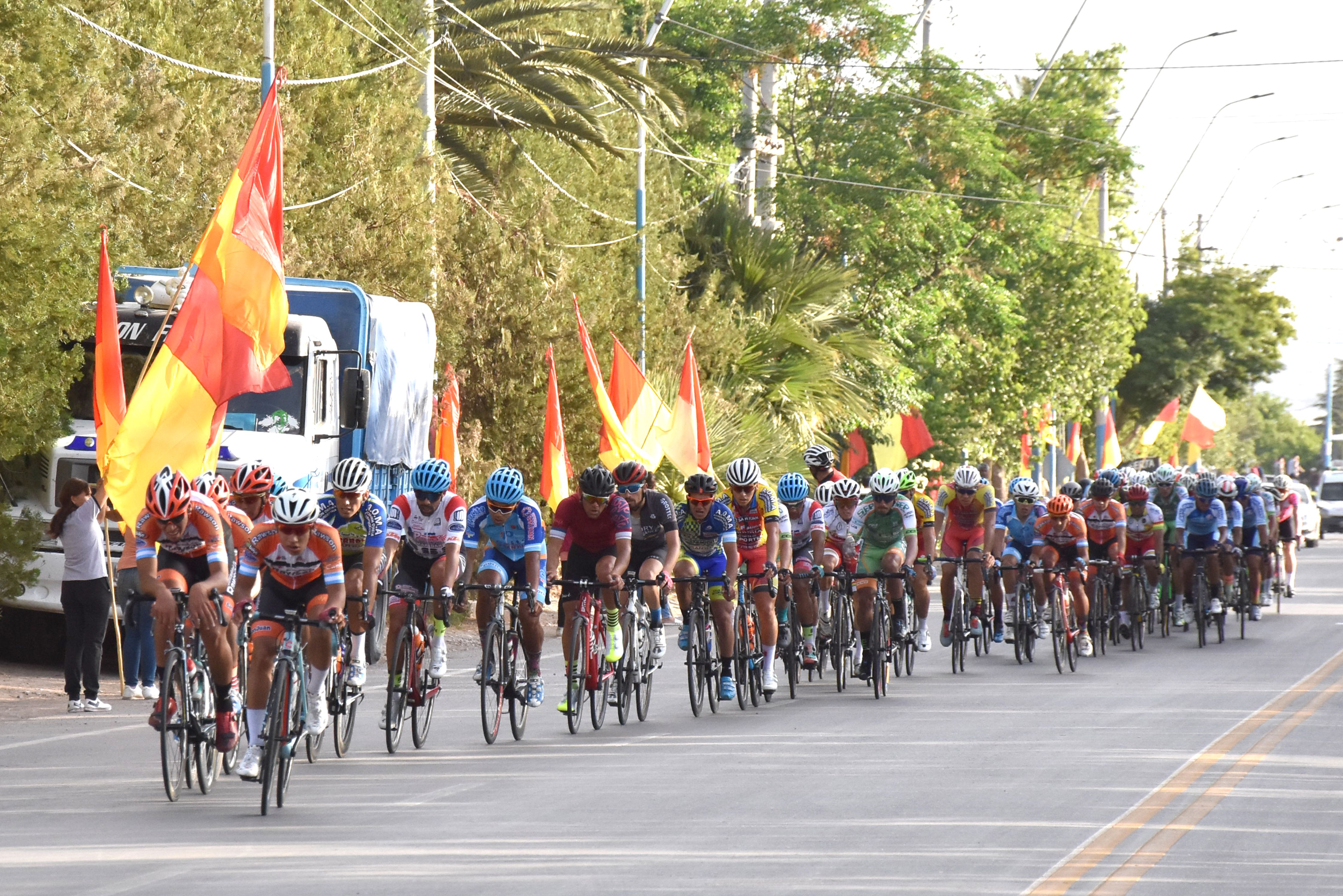 El pelotón transita al Norte por Avenida Uñac en la primera vuelta de la competencia que abrió el calendario de cinco meses y medio. Un arco iris de camisetas engalanó la ruta.