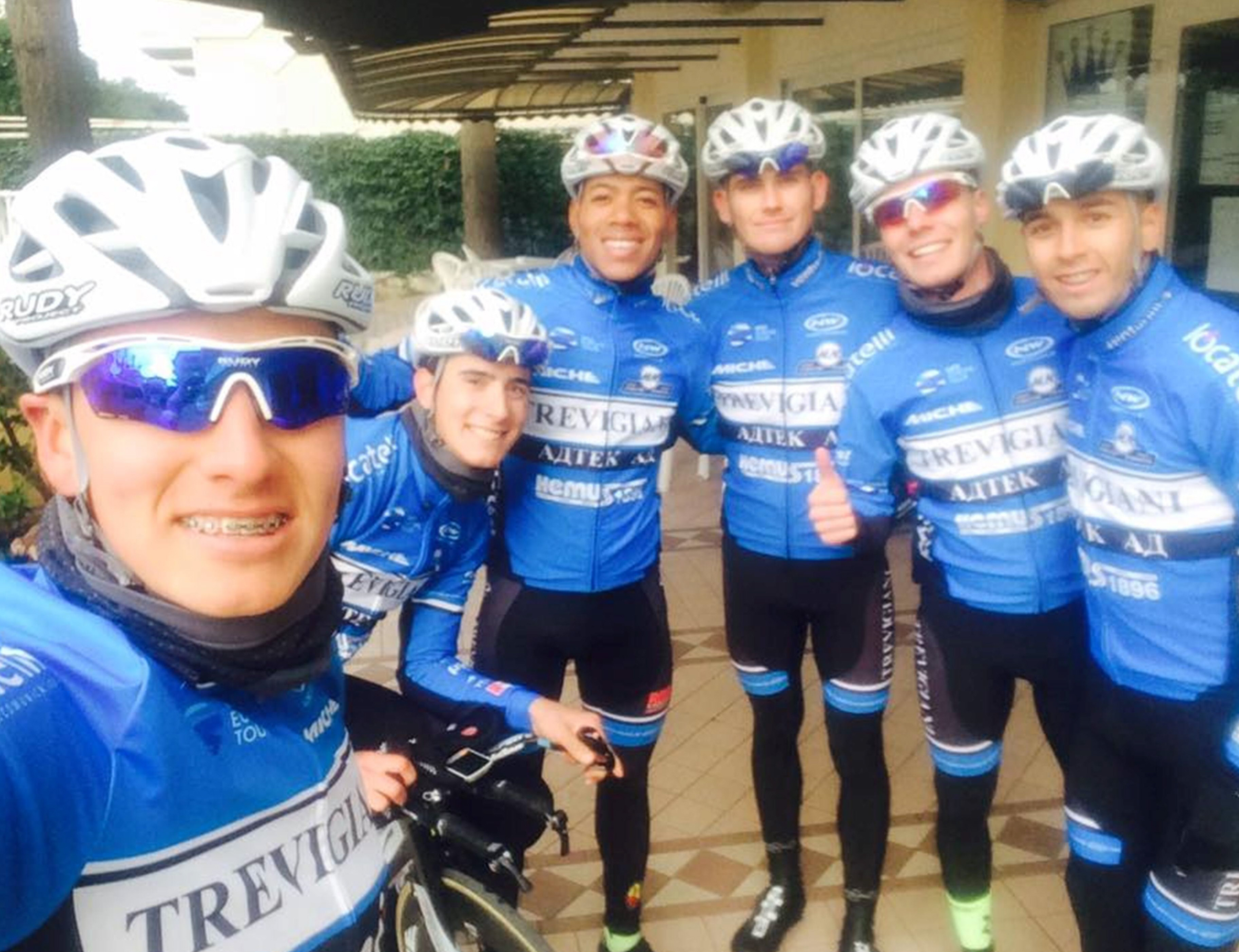 Una selfie. Se sacaron los ciclistas del equipo Treviggiani-Phonix que integra el pocitano. Nicolás Tivani es el primero de la derecha.