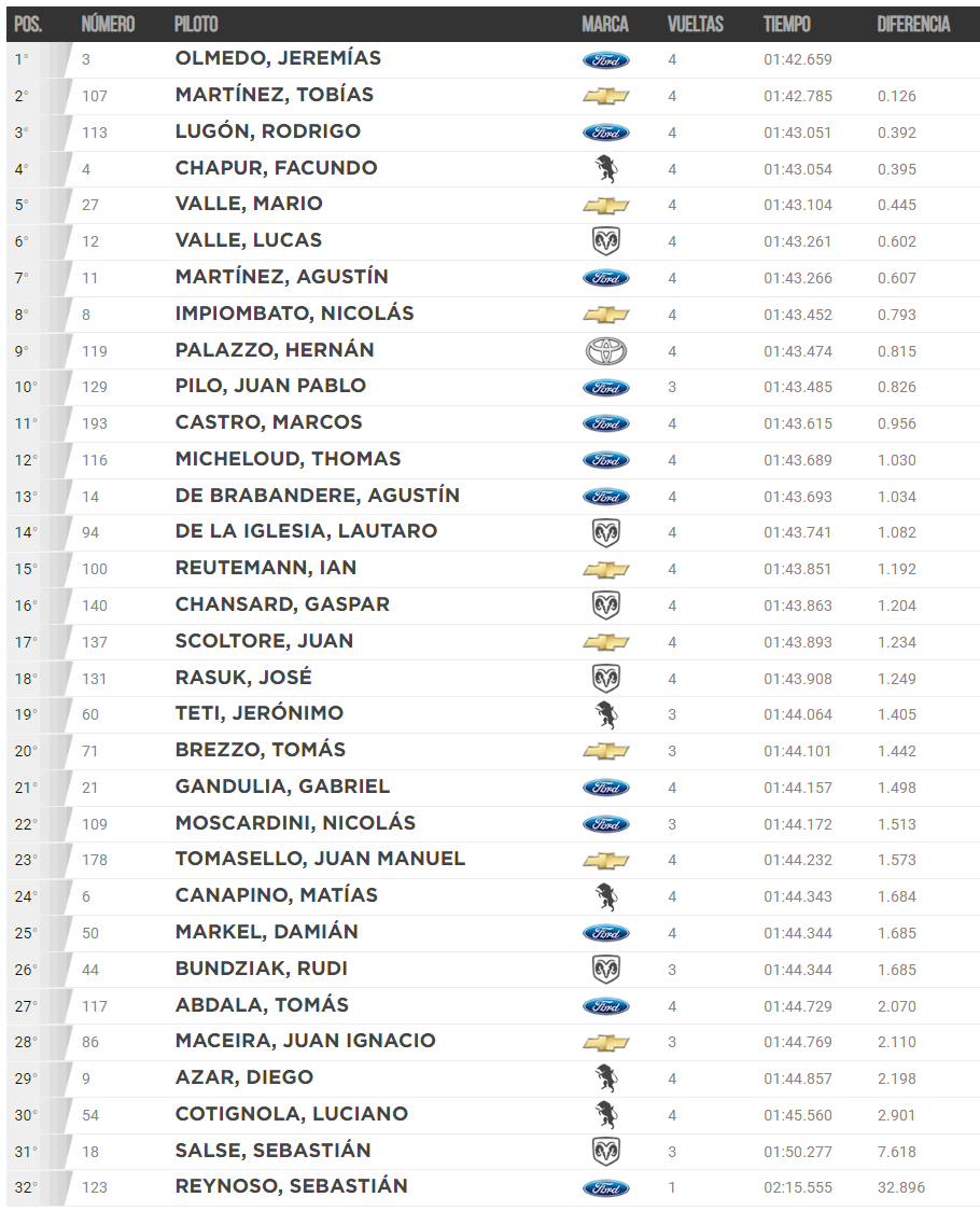 Porque apenas ese lapso de tiempo fue el que determinó que el salteño Jeremías Olmedo se quedara con la pole, en tanto que el piloto sanjuanino (que había sido el más veloz en el segundo ensayo) ocupó el segundo lugar, por lo que estará al frente en el inicio de la segunda serie del domingo, la carrera de 5 vueltas que empezará a las 10,10. En tanto, la final está pautada a 20 giros (o 40 minutos) y empezará a las 11,45.
