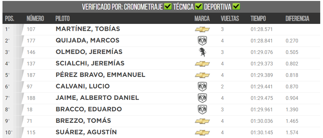 Tobías, máximo ganador de la temporada (3 triunfos) consiguió 3 valiosos puntos en la clasificación, con 40 kilos de lastre, y el tiempo de pole lo consiguió en la primer vuelta rápida que hizo al circuito.