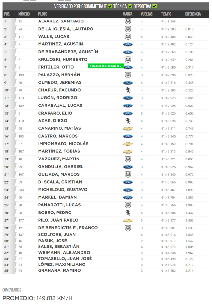Santiago Alvarez, resultó el más veloz de la jornada clasificatoria del TC Pista en San Juan. El representante de Dodge, marcó un tiempo de 1m 42s 368/1000 para sumar además 2 puntos en pos de seguir aumentando su ventaja en la punta del campeonato y conservando su ilusión de ganar la Etapa Regular.