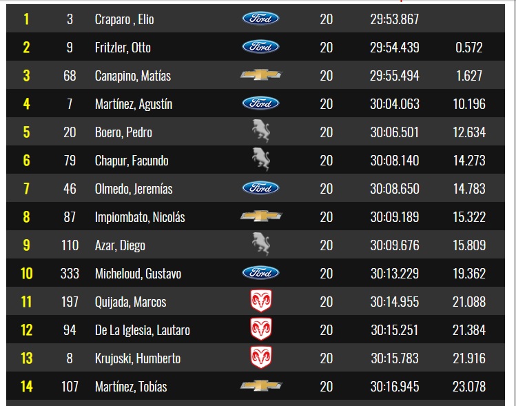 Entre las tres fechas que van del campeonato, esta tercera en Concepción del Uruguay fue la que comenzó con mayores complicaciones para Tobías Martínez. El hecho de no haber podido hacer una vuelta rápida en la clasificación de ayer sábado, lo relegó al puesto 39º, o sea, al penúltimo puesto y finalizar hoy domingo en el puesto 14º, denota la remontada más importante del fin de semana en el TC Pista, ya que de la clasificación del sábado, al cierre de la actividad del domingo, el sanjuanino ganó 25 puestos entre la serie y la final.