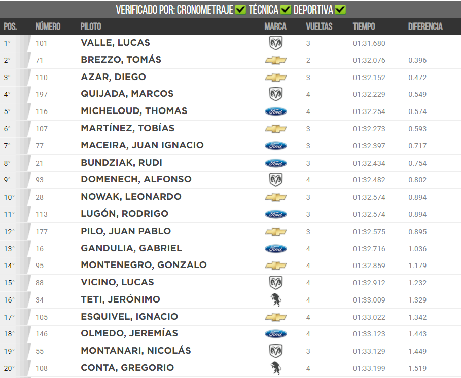 Mañana domingo el sanjuanino, que marcha tercero en el campeonato, partirá tercero en la segunda Serie (que comenzará a las 10,20, en tanto que la primera será a las 9,55), detrás de Quijada, al que lo separan 32 puntos. El escolta, Jeremías Olmedo, también está en esta batería y partirá desde la 9na. posición.