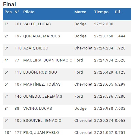Diego Azar, con el Chevrolet de su escuadra, completó el podio. Pese al retraso, Brezzo ya se había clasificado como uno de los “3 del último minuto” a la definición, y ahora se sumaron Lucas Granja y Bruno Boccanera.