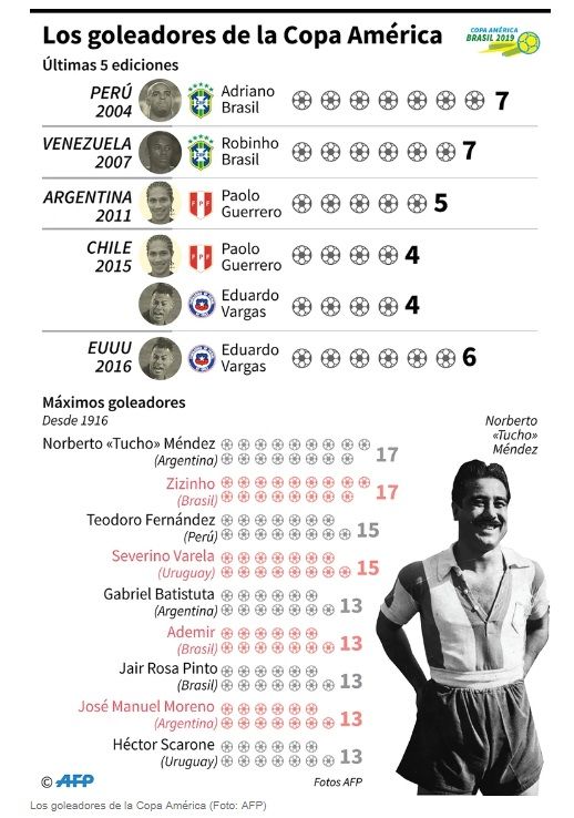 El argentino Norberto Méndez (17) y el brasileño Zizinho (17) son los máximos artilleros históricos. El uruguayo Severino Varela (15) y el peruano Teodoro Fernández (15) continúan el listado. El peruano Paolo Guerrero (11) y el chileno Eduardo Vargas (10) son los dos jugadores que participarán del torneo que suman más tantos.
