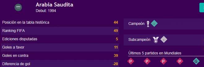 En total, Arabia Saudita jugó 16 encuentros en los mundiales, con apenas tres victorias, dos empates y 11 caídas.