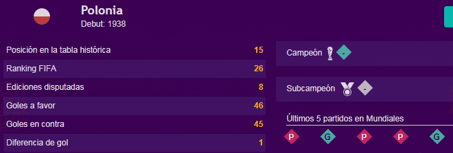 Hay que remontarse a la Eurocopa 2016 para ver unos cuartos de final para Polonia, en los que cayó frente a Portugal, que finalmente sería campeón. Después resalta la triste actuación en la edición 2012, en la que fue local junto a Ucrania y también quedó afuera con otro pobre desempeño en la fase inicial. Las esperanzas y las presiones están concentradas en Robert Lewandowski, que espera ser el líder del plantel que buscará repetir las hazañas polacas de los Mundiales de Alemania 1974 y España 1982.