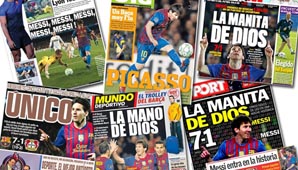 Buenos Aires, 8 de marzo.- Tres de las cuatro tapas de los diarios deportivos más importantes de España aluden a "la mano" o "la manita" (como le llaman allá) "de Dios", con una imagen reluciente de Lionel Messi, quien ayer volvió a encenderse para marcarle cinco tantos al Bayern Leverkusen.
