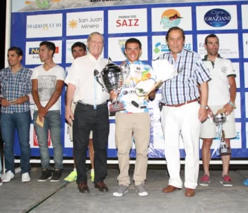 Daniel Zamora, ganador de la clasificación general, recibió anoche la Copa DIARIO DE CUYO y el solcito, el que lo acreditan como el dueño de la XIII edición del Giro del Sol. El muñeco de peluche, que imita al león que se entrega a los ganadores del Tour de Francia, es de mayor tamaño que el que recibieron los triunfadores de cada etapa. El Director de DIARIO DE CUYO, Francisco B. Montes, acompañado de Juan José Chica le dieron el reconocimiento. En tanto, otro momento emotivo de la premiación realizada en Parque Norte, fue la distinción especial a la esposa del Director de DIARIO DE CUYO, María Inés Peñafort de Montes, debido a ser la madrina del Giro. ‘Soy una fanática del ciclismo y aprecio muy especialmente a Oscar Villalobo porque una vez le regaló unos guantes a uno de mis nietos. Además, hace pocos días estuve conversando con él‘, subrayó María Inés Peñafort de Montes, luego de ser reconocida. Mientras que el equipo de la Municipalidad de Pocito se adjudicó la clasificación general por equipos.