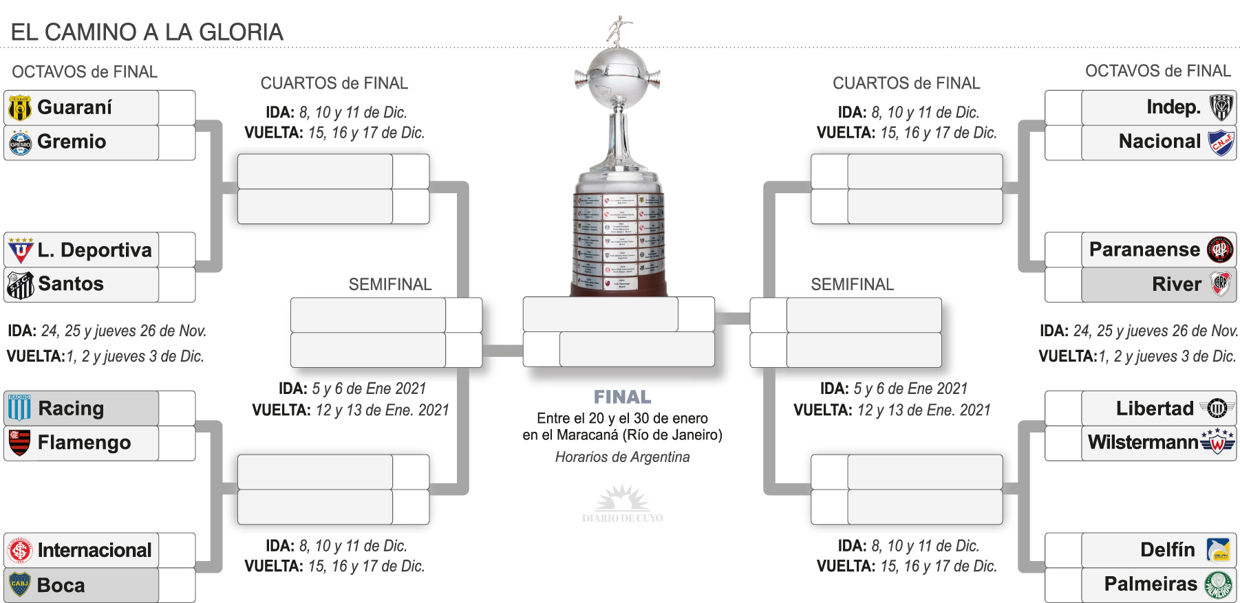 Los dos primeros, al haber ganado sus grupos, definirán las llaves de locales, mientras que la Academia lo hará en el legendario Maracaná, donde justamente está pautada la gran final a fines de enero del 2021. En ese lugar, se podrían enfrentar Boca y River solamente en la definición.