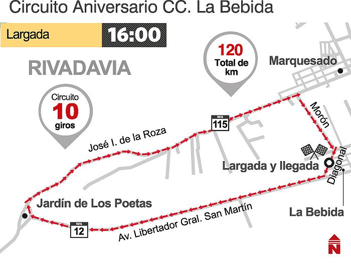 A partir de las 16 en el circuito “chico” que habitualmente utiliza para sus pruebas el Cicles Club La Bebida, se desarrollará la carrera “Aniversario” de la señera entidad rivadaviense, el que desde hace varios años a esta parte clausura la temporada del ciclismo rutero sanjuanino.