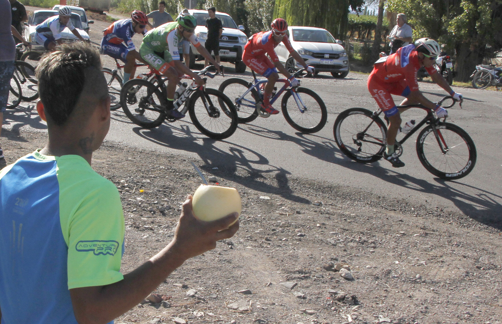 El pelotón gira en una de la arterias veinticinqueñas, y entre el grupo de aficionados un muchacho tenía un melón, con vaya a saber qué bebida, pero seguramente fresca. Uno de los hombres de Chimbas Te Quiero lo mira mientras toma la curva, con un dejo de curiosidad y sana envidia.