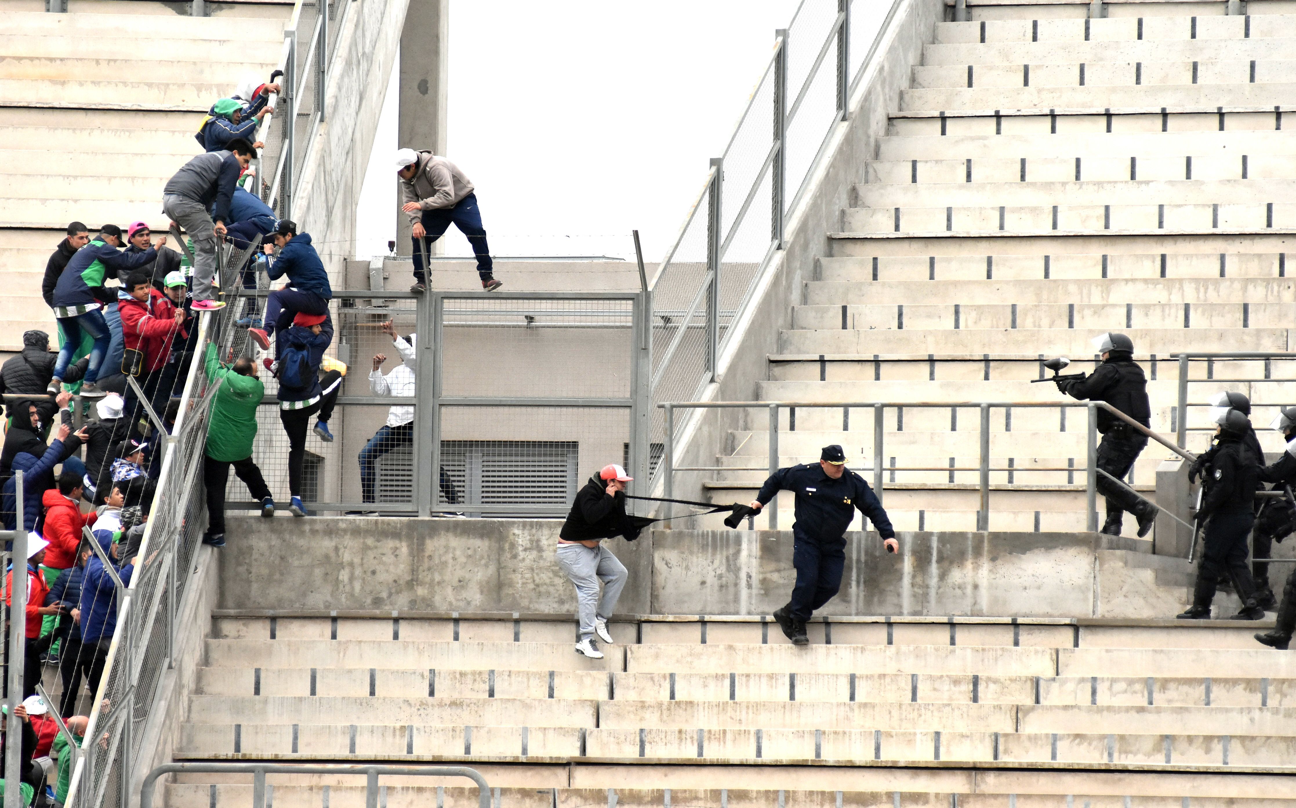 Desborde. La Policía se acerca al grupo de hinchas de Sportivo en la cabecera Norte y detiene a uno. Fue el caos que duró más de media hora y que casi hace suspender la semifinal.