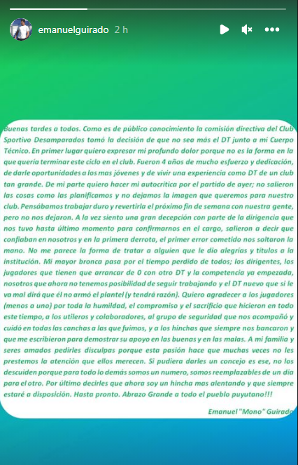 "Quiero expresar mi profundo dolor porque no es la forma en la que quería terminar este ciclo en el club. Fueron 4 años de mucho esfuerzo y dedicación, de darle oportunidades a los más jovenes y de vivir una experiencia como DT de un club tan grande", abre el comunicado difundido en sus redes sociales Guirado.