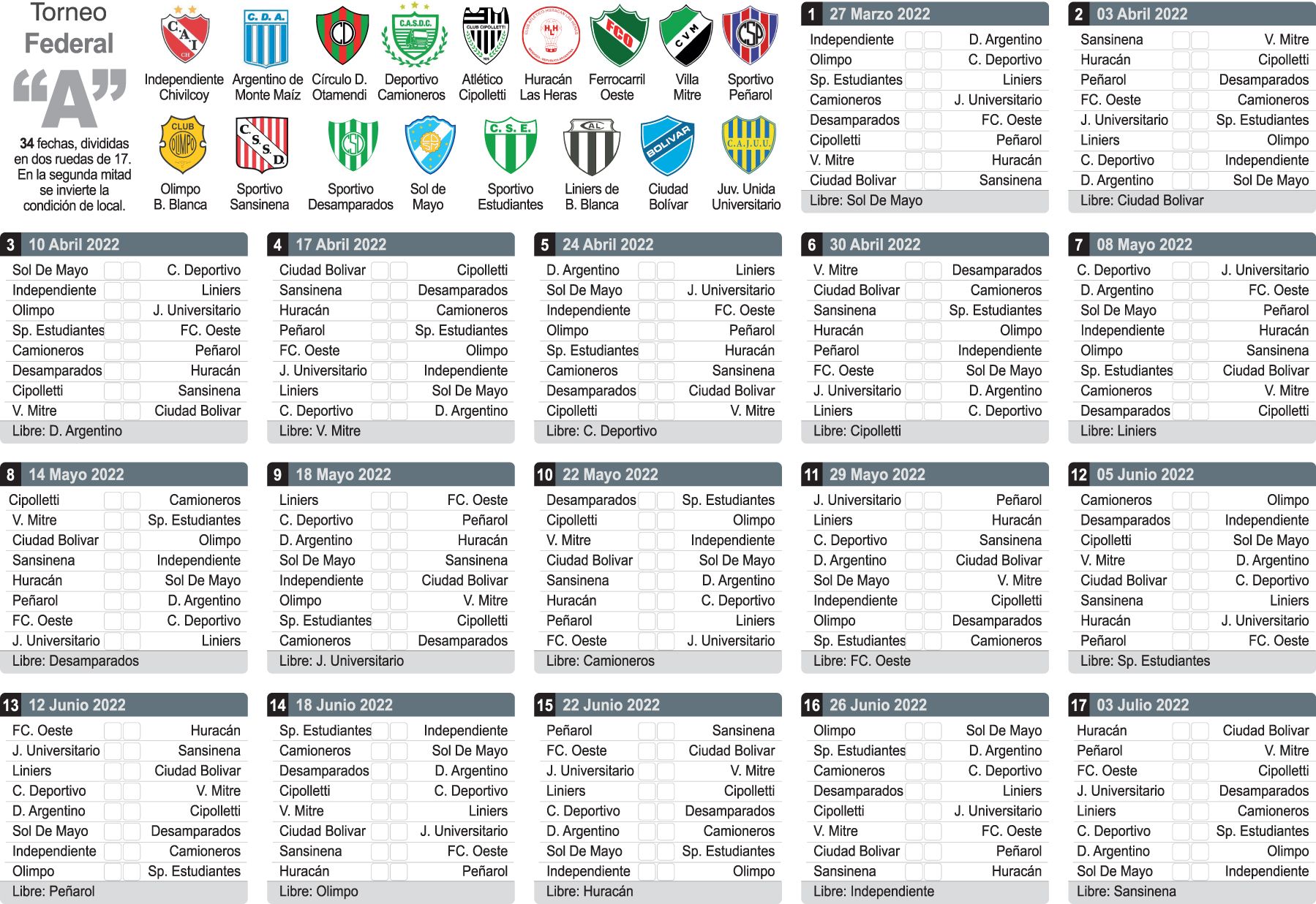 Cabe destacar que después de las 17 fechas de la primera ronda (ver fixture) se invertirán las localías y Desamparados recibirá a Peñarol en la 19na fecha, diagramada para el sábado 16 julio. Es que será intenso el trajín, porque el Federal deberá terminar antes que inicie el Mundial de Qatar y es por eso que habrá varias fechas entre semana.