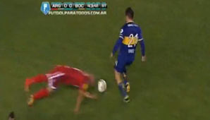 En una jugada que el volante xeneize parecía escaparse de cara al área rival, el jugador del Bicho decidió tirarse al piso para ¡trabar con la cabeza! el avence del Pichi.