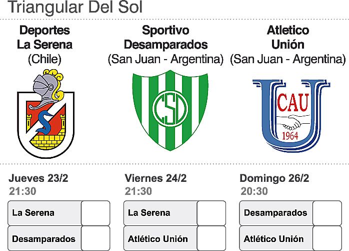 El fútbol de San Juan no podía quedarse afuera de los festejos de la Fiesta del Sol que hoy domina los tiempos en la provincia y de la mano de la Secretaría de Deportes, esta noche a partir de las 21,30 en el estadio San Juan del Bicentenario se jugará la primera fecha del Triangular del Sol con la presentación de Sportivo Desamparados frente a la juvenil formación de Deportes La Serena de Chile, quedando para mañana viernes la presentación de Atlético Unión ante los serenenses y teniendo como plato final el clásico del domingo entre Sportivo y Unión, tras los cambios que decidió la organización respecto del formato inicialmente informado.