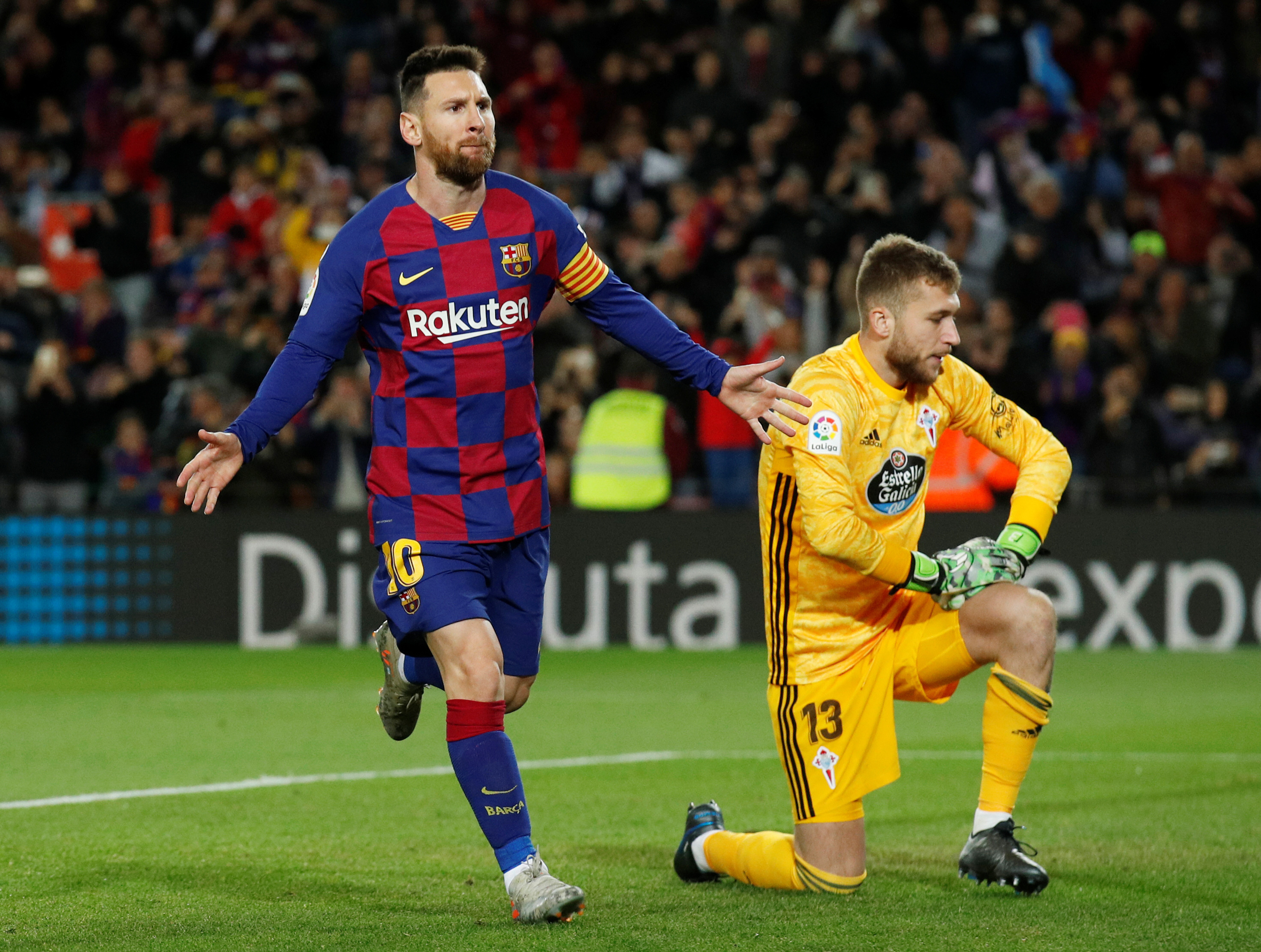De festejo. Messi celebra uno de sus goles mientras el arquero del Celta lo sufre. El astro argentino se despachó con tres pepas y el Barca es líder.