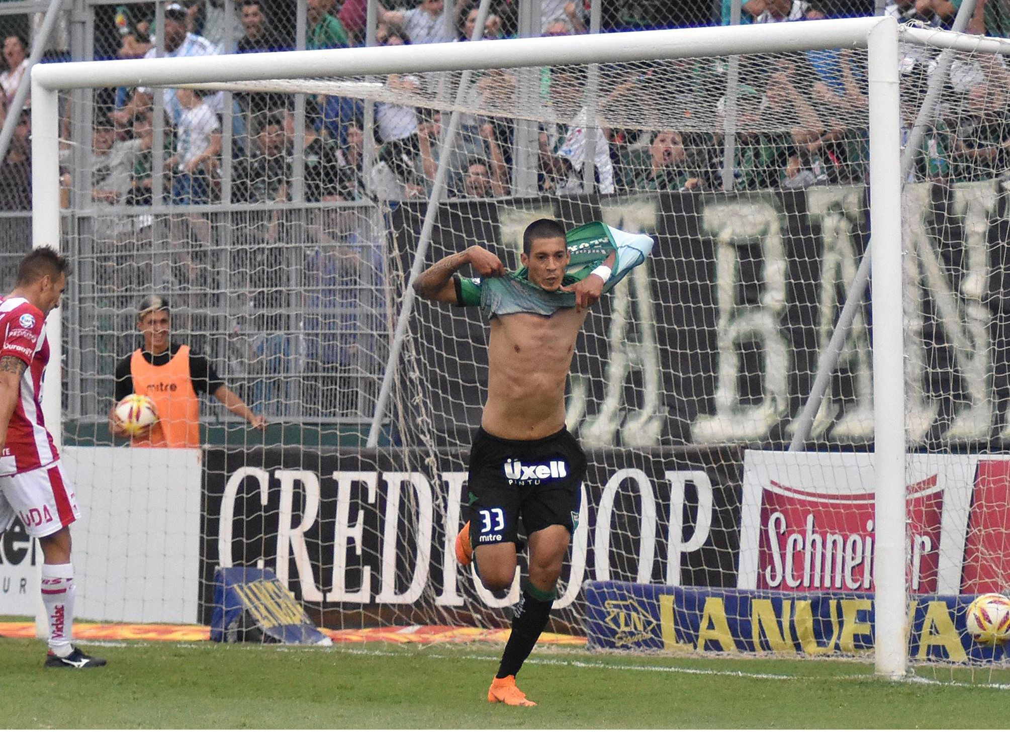 Festejo alocado. Pablo Palacios Alvarenga sale disparado festejando su primer gol a Unión. Se saca la camiseta mientras un rival mira con tristeza la pelota en el fondo del arco. Esta vez le sobró efectividad al equipo sanjuanino y concretó un triunfo vital.