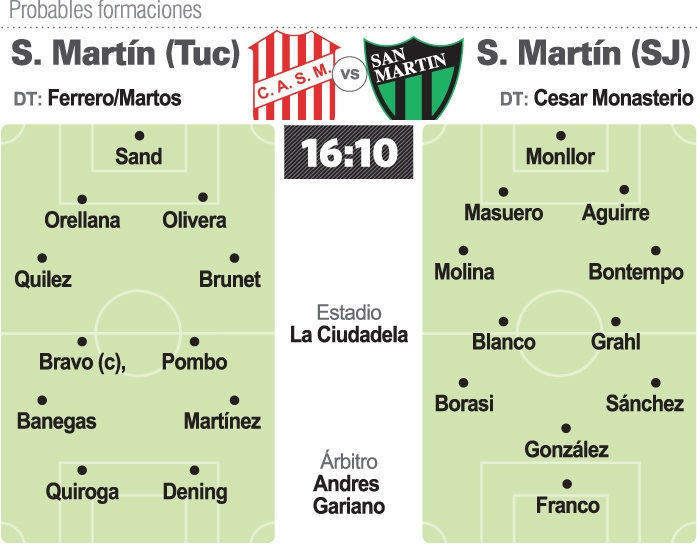 Invicto en el ciclo Monasterio aunque de mayor a menor en su producción desde aquella victoria sobre Estudiantes de Río Cuarto, hoy el desafío para el Atlético San Martín tiene su mismo nombre pero se le presenta en San Miguel de Tucumán donde visitará desde las 16,10 al Santo tucumano en La Ciudadela, buscando la real medida de su realidad. El Verdinegro sanjuanino viene de empatar sin goles con Chicago en una discreta producción colectiva a la que le faltó frescura en los tramos decisivos. No generó todo lo que intentó proponer y terminó sin goles, ni juego. Hoy, con más espacios por las necesidades de su anfitrión, puede que el escenario sea más favorable y se asemeje a lo que mostró ante All Boys cuando jugó bien, creó situaciones y mereció ganarlo.