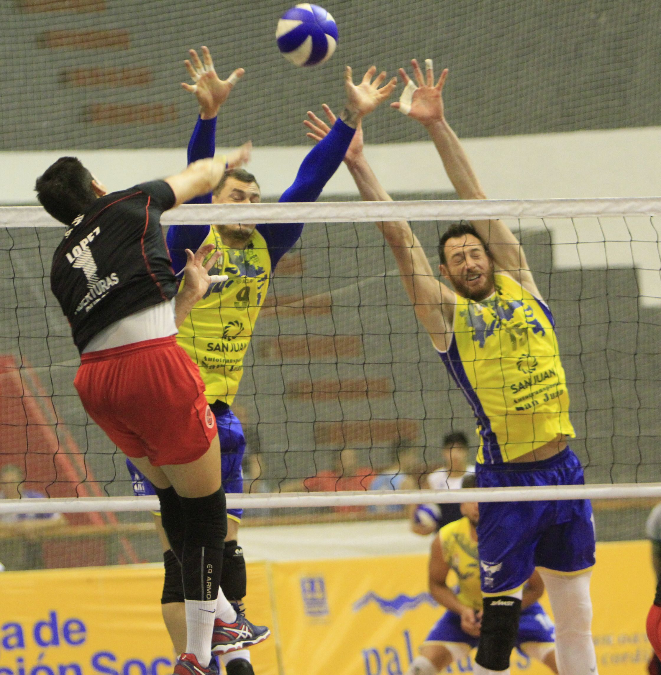 Doble bloqueo. De los jugadores de UPCN le corta los caminos al ataque de López, de Libertad. El visitante sorprendió al Gremial pero después reaccionó.