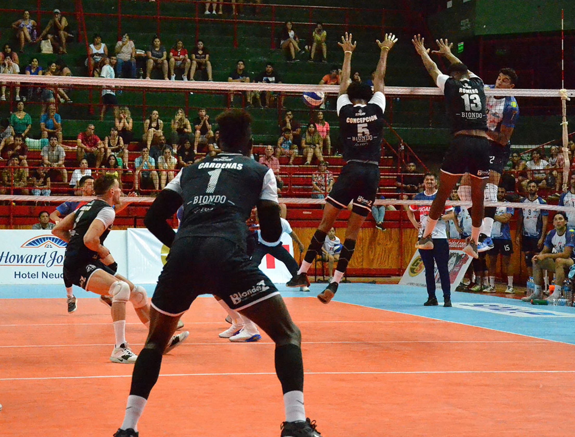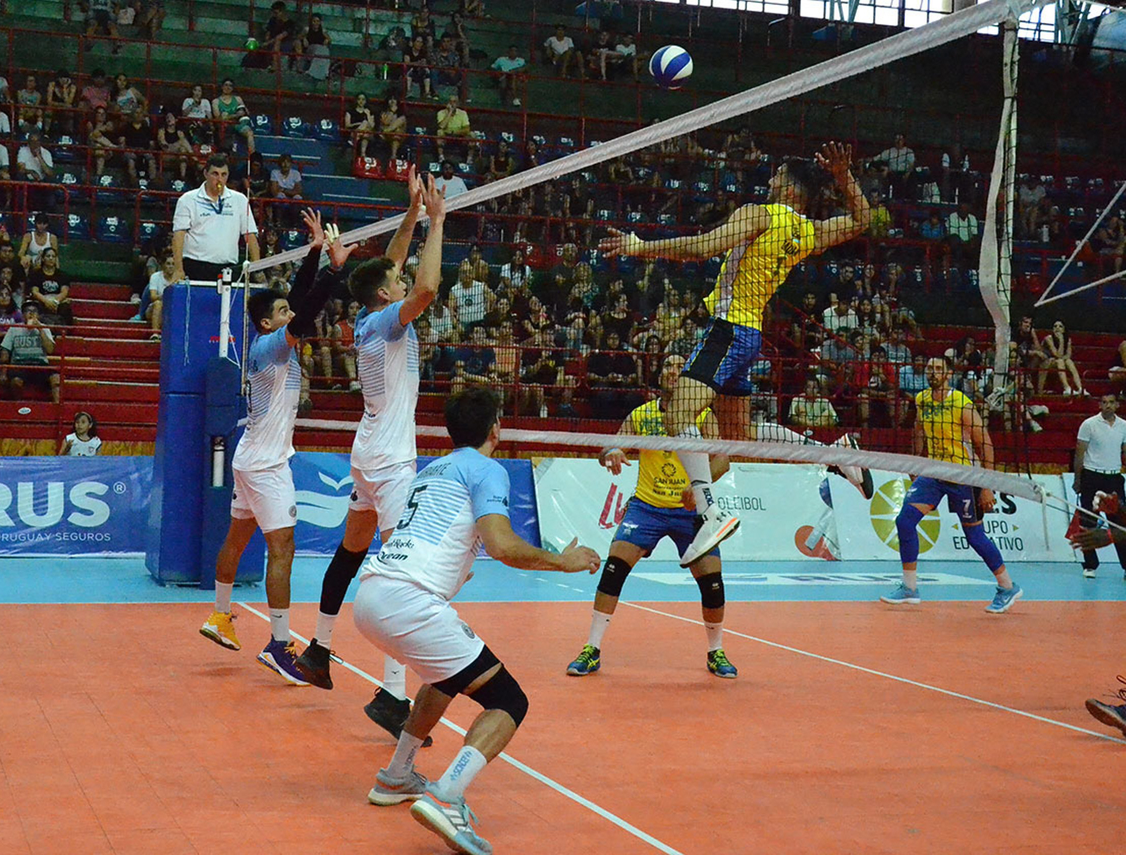 Primer tiempo. El armado de Sebastián Brajkovic dejó abierto el bloqueo de Bolívar y Maximiliano Gauna está listo para el remate. UPCN se quedó con el clásico y es finalista.