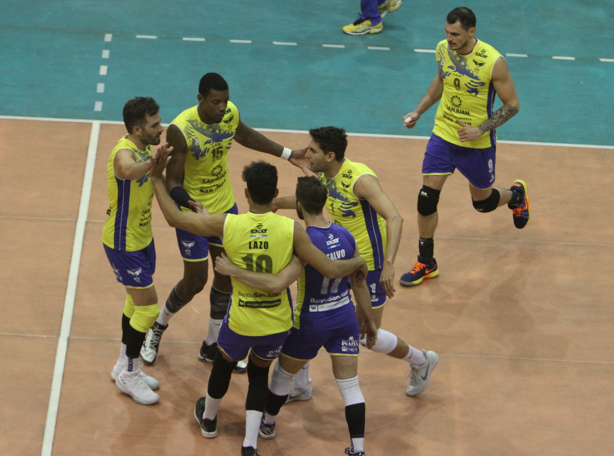 De festejo. Los jugadores de UPCN festejan uno de los tantos ante Obras. Tras un partido cambiante, el equipo de Armoa ganó en el tie break el clásico sanjuanino.