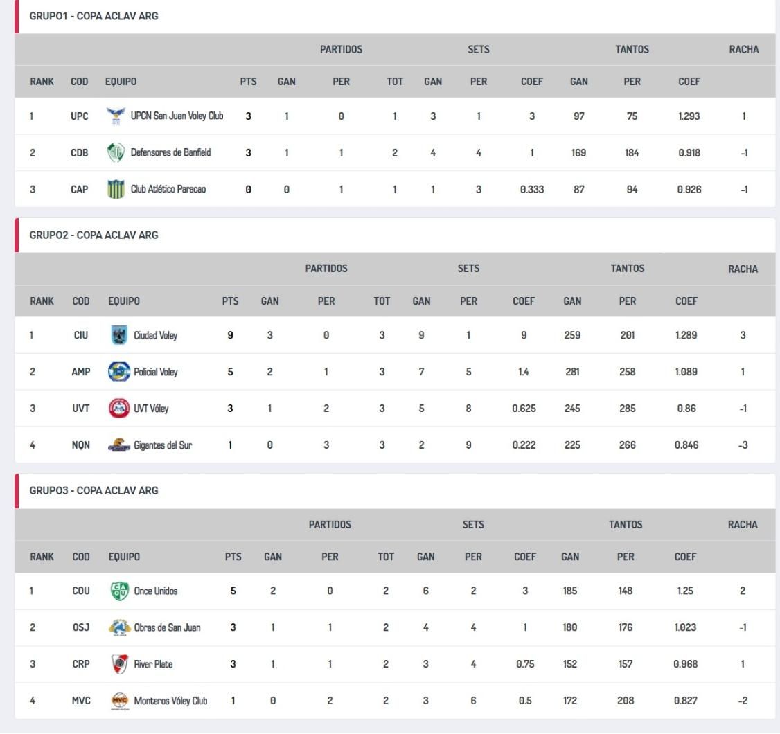 En la tercera jornada de la Copa ACLAV, por el grupo 2, UVT cayó ante Ciudad en sets seguidos y previamente Policial de Formosa había derrotado por el mismo marcador a Gigantes, por lo que el elenco sanjuanino clasificó como tercero del grupo a los cuartos de final.