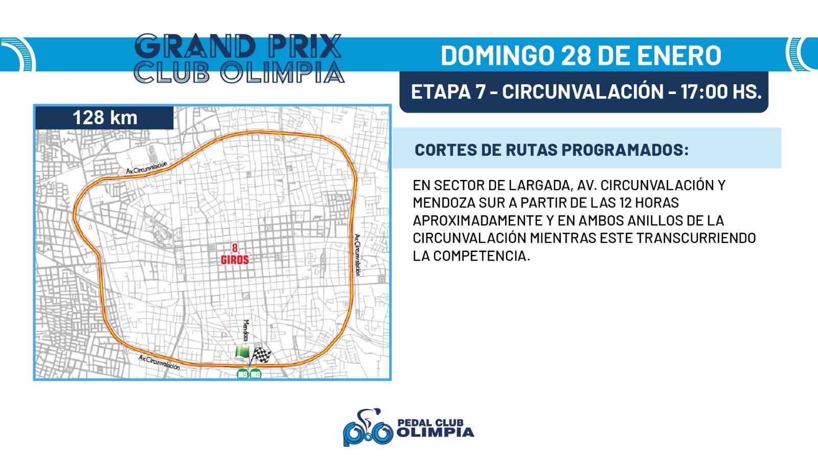 Este domingo 28, los amantes del ciclismo en San Juan vivirán la emocionante culminación del Grand Prix Pedal Club Olimpia, con la última etapa que recorrerá la Avenida de Circunvalación en 8 giros, sumando un total de 128 km.