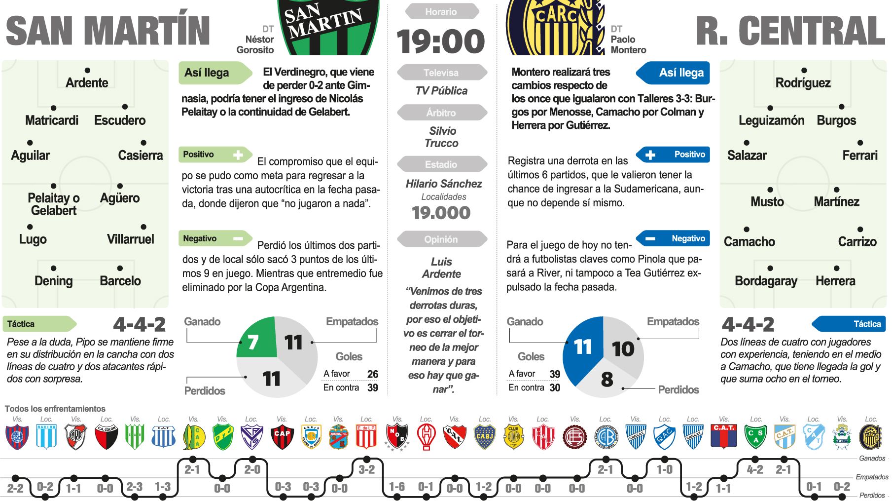 San Martín viene de perder el primer partido de visitante del año y el primero de la era Gorosito ante Gimnasia por 2-0. Encuentro en el que el equipo no tuvo un buen rendimiento y que asumieron los protagonistas. "Vinimos a buscar el triunfo pero jugamos mal de vuelta. Todo lo bueno que hicimos antes lo tiramos con las dos últimas derrotas’, confesó el martes pasado en La Plata Emanuel Dening, quien hoy continuará haciendo dupla en ataque con Facundo Barcelo.
