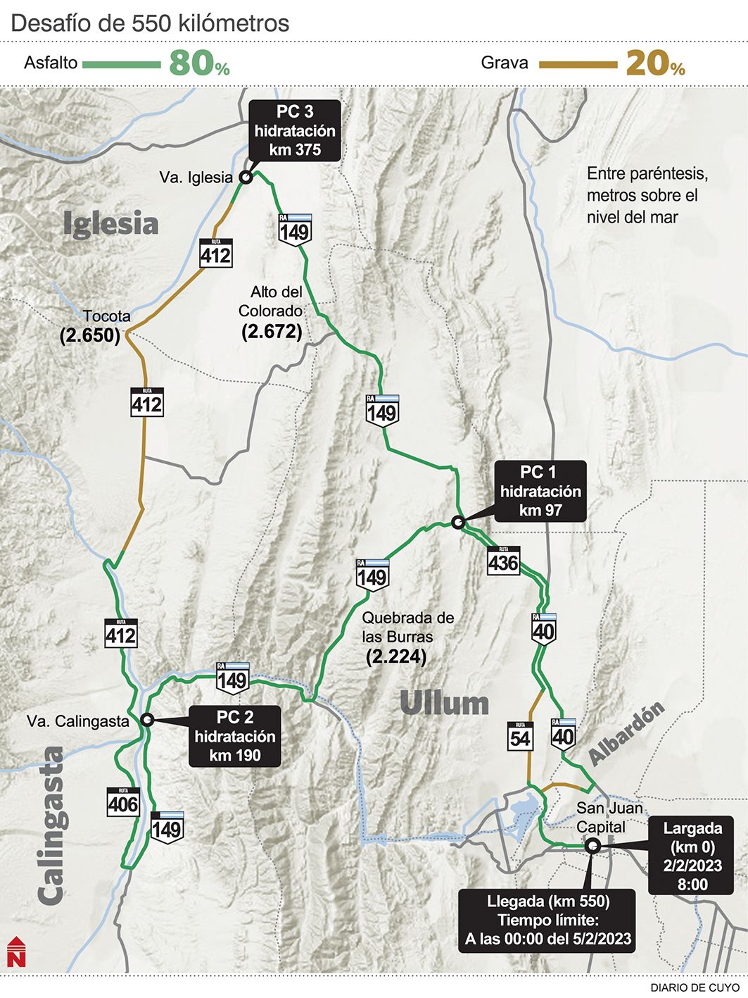 Si hay un lugar ideal para el mountain bike, San Juan no puede estar afuera de cualquier lista. Y organizado por Brevet Argentina (@brevetargentina), el Desafío Ultra, se suma a una tendencia mundial en auge y propone vivir una experiencia sin precedentes para la provincia. Del 2 al 5 de febrero, en modalidad non-stop y sin asistencia, quienes participen, deberán completar en menos de 64 horas, un recorrido de 550 kilómetros que atravesará los diversos paisajes de la precordillera sanjuanina, combinando distintas rutas nacionales y provinciales de asfalto y tierra. El recorrido comenzará en la ciudad de San Juan el día Jueves 2 de Febrero a las 8.00 am y luego de pasar por el Dique de Ullúm, tomará dirección al norte hacia el Villicum para seguir por ruta 40 hasta Talacasto. Allí el camino seguirá hacia el Oeste hasta encontrar ruta 149 para llegar a Calingasta. Una vez ahí, será por ruta 412, pasando por Puchuzún, Villanueva y Tocota que se llegará a Iglesia luego de 375 kilómetros. Será desde ese punto, donde iniciarán la subida hasta el Alto del Colorado, buscando luego retomar ruta 40 nuevamente para regresar a la capital, teniendo como hora límite las 11:59 del día sábado 5 de febrero.