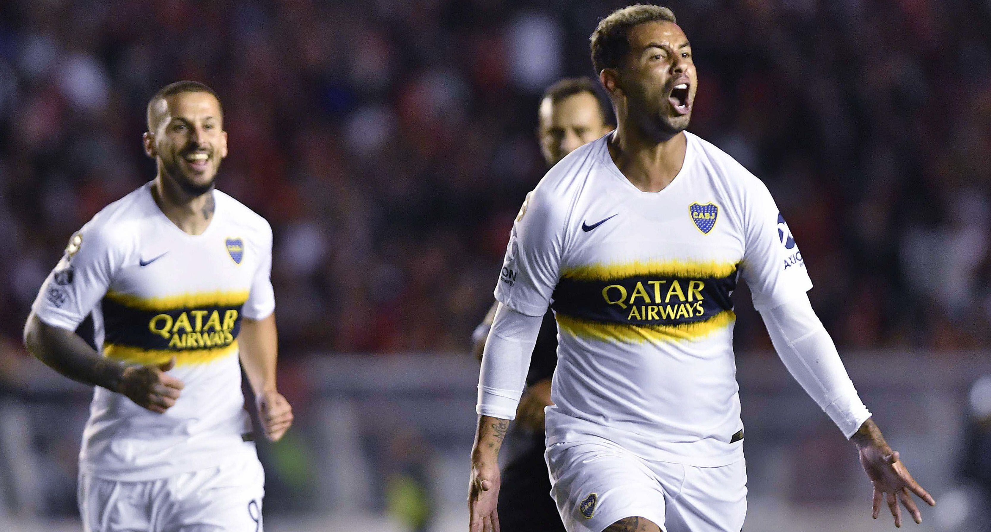 Pura alegría. El colombiano Cardona ya se despachó con su golazo y sale a festejarlo como se debe. Boca casi que no había llegado pero cuando lo hizo metió ese puñal y lo terminó ganando en Avellaneda.