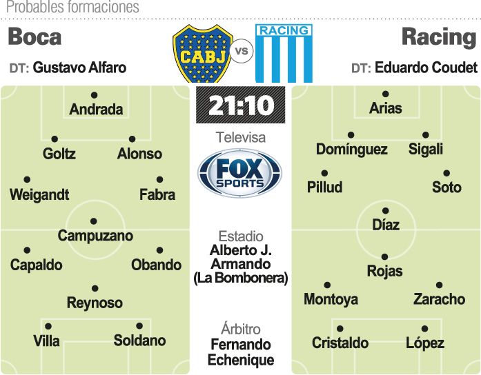 En Racing, el "Chacho" Coudet repetirá la formación que le ganó hace dos semanas a Aldosivi antes del receso por la fecha FIFA, pese a que está recuperado de una lesión muscular el zaguero Alejandro Donatti, quien será suplente. La Academia sabe que está ante una buena ocasión, ya que de ganar se acercará a la cima, y además Boca no le opondrá su máximo potencial.