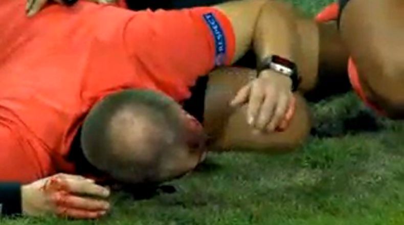 En Europa también pasan estos hechos lamentables. El partido que disputaban el Sturm Graz de Austria y el AEK Larnaka de Chipre tuvo que ser interrumpido luego de que uno de los árbitros asistentes recibió un botellazo en su cabeza lanzado desde la tribuna.