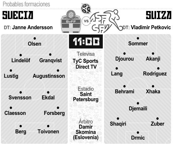 Suecia y Suiza afrontarán hoy desde las 11 en San Petersburgo un duelo en pos de los cuartos de final del Mundial de Rusia 2018 en el que la solidez del conjunto escandinavo, con sólo dos goles en contra en tres partidos, enfrenta al volcán suizo, experto en remontar partidos. Pocos esperaban unos octavos de final con estos dos protagonistas. Suecia, que accedió a este Mundial dejando por el camino a Italia, superó un grupo con la vigente campeona, Alemania, que sólo pudo doblegarle en el minuto 95 (2-1). Antes derrotó a Corea del Sur (1-0) y después arrasó a México (0-3) para meterse entre los dieciséis elegidos.