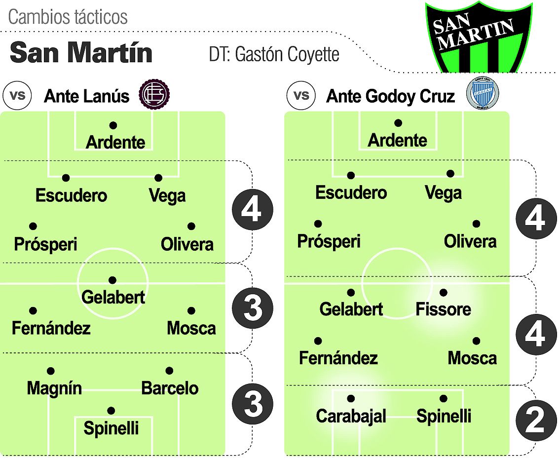 Matías Fissore volverá a ser titular luego de más de un año, ya que las lesiones le impidieron estar en óptimas condiciones y recién reapareció en la fecha pasada ante el Granate jugando los últimos 21 minutos del complemento. Mientras que Carabajal, quien antes de llegar a la vida de San Martín jugó en Godoy Cruz, regresará al equipo tras dos fechas.